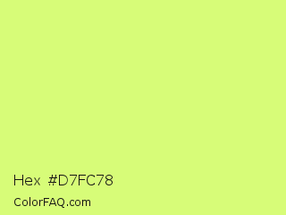Hex #d7fc78 Color is a light lime color and the nearest color is Mindaro #e3f988. Hex code #d7fc78 and RGB value is rgb(215,252,120). In RGB color space, this color is composed of 84% red, 99% green, 47% blue, In CMYK color space, this color is composed of 15% cyan, 0% magenta, 52% yellow , 1% black , In HSL color space, this color has a hue angle of 77° , 96% saturation and 73% lightness.