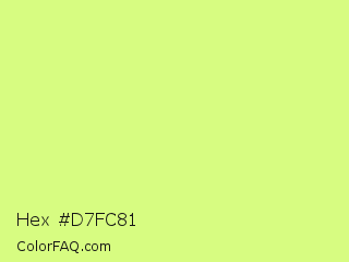 Hex #d7fc81 Color is a light lime color and the nearest color is Mindaro #e3f988. Hex code #d7fc81 and RGB value is rgb(215,252,129). In RGB color space, this color is composed of 84% red, 99% green, 51% blue, In CMYK color space, this color is composed of 15% cyan, 0% magenta, 49% yellow , 1% black , In HSL color space, this color has a hue angle of 78° , 95% saturation and 75% lightness.