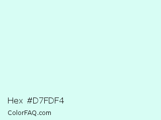 Hex #d7fdf4 Color is a very light cyan color and the nearest color is Frosted Mint #dbfff8. Hex code #d7fdf4 and RGB value is rgb(215,253,244). In RGB color space, this color is composed of 84% red, 99% green, 96% blue, In CMYK color space, this color is composed of 15% cyan, 0% magenta, 4% yellow , 1% black , In HSL color space, this color has a hue angle of 166° , 90% saturation and 92% lightness.