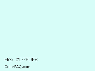 Hex #d7fdf8 Color is a very light cyan color and the nearest color is Foam #d8fcfa. Hex code #d7fdf8 and RGB value is rgb(215,253,248). In RGB color space, this color is composed of 84% red, 99% green, 97% blue, In CMYK color space, this color is composed of 15% cyan, 0% magenta, 2% yellow , 1% black , In HSL color space, this color has a hue angle of 172° , 90% saturation and 92% lightness.