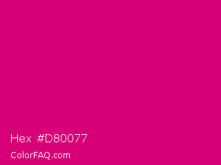 Hex #d80077 Color is a normal magenta color and the nearest color is Red Purple #e40078. Hex code #d80077 and RGB value is rgb(216,0,119). In RGB color space, this color is composed of 85% red, 0% green, 47% blue, In CMYK color space, this color is composed of 0% cyan, 100% magenta, 45% yellow , 15% black , In HSL color space, this color has a hue angle of 327° , 100% saturation and 42% lightness.