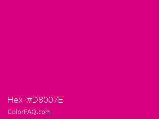 Hex #d8007e Color is a normal magenta color and the nearest color is Mexican Pink #e4007c. Hex code #d8007e and RGB value is rgb(216,0,126). In RGB color space, this color is composed of 85% red, 0% green, 49% blue, In CMYK color space, this color is composed of 0% cyan, 100% magenta, 42% yellow , 15% black , In HSL color space, this color has a hue angle of 325° , 100% saturation and 42% lightness.