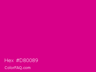 Hex #d80089 Color is a normal magenta color and the nearest color is Mexican Pink #e4007c. Hex code #d80089 and RGB value is rgb(216,0,137). In RGB color space, this color is composed of 85% red, 0% green, 54% blue, In CMYK color space, this color is composed of 0% cyan, 100% magenta, 37% yellow , 15% black , In HSL color space, this color has a hue angle of 322° , 100% saturation and 42% lightness.