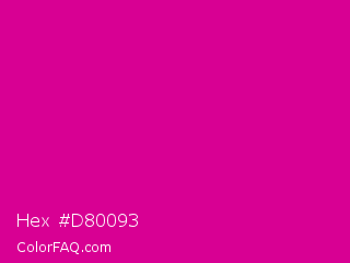 Hex #d80093 Color is a normal magenta color and the nearest color is Mexican Pink #e4007c. Hex code #d80093 and RGB value is rgb(216,0,147). In RGB color space, this color is composed of 85% red, 0% green, 58% blue, In CMYK color space, this color is composed of 0% cyan, 100% magenta, 32% yellow , 15% black , In HSL color space, this color has a hue angle of 319° , 100% saturation and 42% lightness.