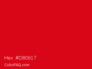 Hex #d80617 Color is a normal red color and the nearest color is Harvard Crimson #c90016. Hex code #d80617 and RGB value is rgb(216,6,23). In RGB color space, this color is composed of 85% red, 2% green, 9% blue, In CMYK color space, this color is composed of 0% cyan, 97% magenta, 89% yellow , 15% black , In HSL color space, this color has a hue angle of 355° , 95% saturation and 44% lightness.