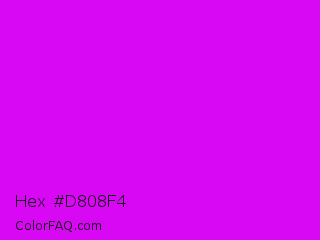 Hex #d808f4 Color is a normal magenta color and the nearest color is Phlox #df00ff. Hex code #d808f4 and RGB value is rgb(216,8,244). In RGB color space, this color is composed of 85% red, 3% green, 96% blue, In CMYK color space, this color is composed of 11% cyan, 97% magenta, 0% yellow , 4% black , In HSL color space, this color has a hue angle of 293° , 94% saturation and 49% lightness.