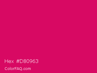 Hex #d80963 Color is a normal rose color and the nearest color is Ruby #e0115f. Hex code #d80963 and RGB value is rgb(216,9,99). In RGB color space, this color is composed of 85% red, 4% green, 39% blue, In CMYK color space, this color is composed of 0% cyan, 96% magenta, 54% yellow , 15% black , In HSL color space, this color has a hue angle of 334° , 92% saturation and 44% lightness.