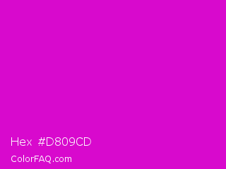Hex #d809cd Color is a normal magenta color and the nearest color is Deep Magenta #cc00cc. Hex code #d809cd and RGB value is rgb(216,9,205). In RGB color space, this color is composed of 85% red, 4% green, 80% blue, In CMYK color space, this color is composed of 0% cyan, 96% magenta, 5% yellow , 15% black , In HSL color space, this color has a hue angle of 303° , 92% saturation and 44% lightness.