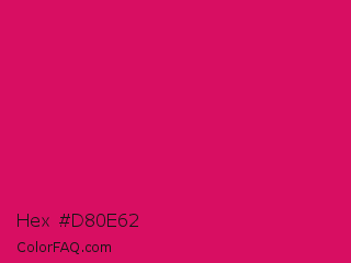 Hex #d80e62 Color is a normal rose color and the nearest color is Ruby #e0115f. Hex code #d80e62 and RGB value is rgb(216,14,98). In RGB color space, this color is composed of 85% red, 5% green, 38% blue, In CMYK color space, this color is composed of 0% cyan, 94% magenta, 55% yellow , 15% black , In HSL color space, this color has a hue angle of 335° , 88% saturation and 45% lightness.