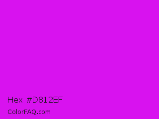 Hex #d812ef Color is a normal magenta color and the nearest color is Phlox #df00ff. Hex code #d812ef and RGB value is rgb(216,18,239). In RGB color space, this color is composed of 85% red, 7% green, 94% blue, In CMYK color space, this color is composed of 10% cyan, 92% magenta, 0% yellow , 6% black , In HSL color space, this color has a hue angle of 294° , 87% saturation and 50% lightness.