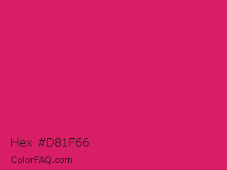 Hex #d81f66 Color is a normal rose color and the nearest color is Dogwood Rose #d71868. Hex code #d81f66 and RGB value is rgb(216,31,102). In RGB color space, this color is composed of 85% red, 12% green, 40% blue, In CMYK color space, this color is composed of 0% cyan, 86% magenta, 53% yellow , 15% black , In HSL color space, this color has a hue angle of 337° , 75% saturation and 48% lightness.