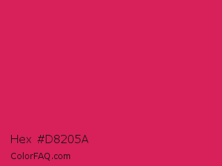 Hex #d8205a Color is a normal rose color and the nearest color is Dogwood Rose #d71868. Hex code #d8205a and RGB value is rgb(216,32,90). In RGB color space, this color is composed of 85% red, 13% green, 35% blue, In CMYK color space, this color is composed of 0% cyan, 85% magenta, 58% yellow , 15% black , In HSL color space, this color has a hue angle of 341° , 74% saturation and 49% lightness.