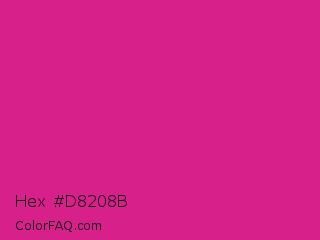 Hex #d8208b Color is a normal magenta color and the nearest color is Barbie Pink #e0218a. Hex code #d8208b and RGB value is rgb(216,32,139). In RGB color space, this color is composed of 85% red, 13% green, 55% blue, In CMYK color space, this color is composed of 0% cyan, 85% magenta, 36% yellow , 15% black , In HSL color space, this color has a hue angle of 325° , 74% saturation and 49% lightness.
