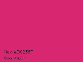 Hex #d8256f Color is a normal rose color and the nearest color is Razzmatazz #e3256b. Hex code #d8256f and RGB value is rgb(216,37,111). In RGB color space, this color is composed of 85% red, 15% green, 44% blue, In CMYK color space, this color is composed of 0% cyan, 83% magenta, 49% yellow , 15% black , In HSL color space, this color has a hue angle of 335° , 71% saturation and 50% lightness.