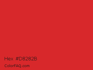 Hex #d8282b Color is a normal red color and the nearest color is Amaranth Red #d3212d. Hex code #d8282b and RGB value is rgb(216,40,43). In RGB color space, this color is composed of 85% red, 16% green, 17% blue, In CMYK color space, this color is composed of 0% cyan, 81% magenta, 80% yellow , 15% black , In HSL color space, this color has a hue angle of 359° , 69% saturation and 50% lightness.