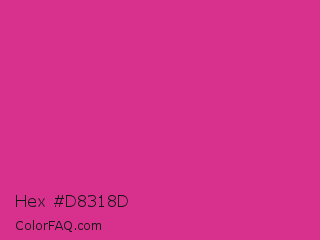 Hex #d8318d Color is a normal magenta color and the nearest color is Cerise #da3287. Hex code #d8318d and RGB value is rgb(216,49,141). In RGB color space, this color is composed of 85% red, 19% green, 55% blue, In CMYK color space, this color is composed of 0% cyan, 77% magenta, 35% yellow , 15% black , In HSL color space, this color has a hue angle of 327° , 68% saturation and 52% lightness.