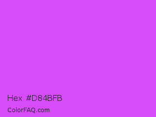 Hex #d84bfb Color is a light purple color and the nearest color is Heliotrope #df73ff. Hex code #d84bfb and RGB value is rgb(216,75,251). In RGB color space, this color is composed of 85% red, 29% green, 98% blue, In CMYK color space, this color is composed of 14% cyan, 70% magenta, 0% yellow , 2% black , In HSL color space, this color has a hue angle of 288° , 96% saturation and 64% lightness.