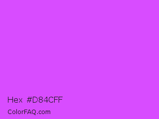 Hex #d84cff Color is a light purple color and the nearest color is Heliotrope #df73ff. Hex code #d84cff and RGB value is rgb(216,76,255). In RGB color space, this color is composed of 85% red, 30% green, 100% blue, In CMYK color space, this color is composed of 15% cyan, 70% magenta, 0% yellow , 0% black , In HSL color space, this color has a hue angle of 287° , 100% saturation and 65% lightness.