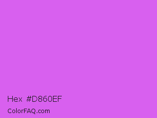 Hex #d860ef Color is a light purple color and the nearest color is Heliotrope #df73ff. Hex code #d860ef and RGB value is rgb(216,96,239). In RGB color space, this color is composed of 85% red, 38% green, 94% blue, In CMYK color space, this color is composed of 10% cyan, 60% magenta, 0% yellow , 6% black , In HSL color space, this color has a hue angle of 290° , 82% saturation and 66% lightness.