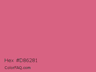 Hex #d86281 Color is a light rose color and the nearest color is Blush #de5d83. Hex code #d86281 and RGB value is rgb(216,98,129). In RGB color space, this color is composed of 85% red, 38% green, 51% blue, In CMYK color space, this color is composed of 0% cyan, 55% magenta, 40% yellow , 15% black , In HSL color space, this color has a hue angle of 344° , 60% saturation and 62% lightness.