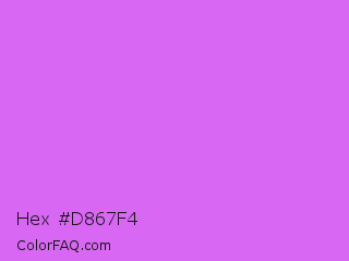 Hex #d867f4 Color is a light purple color and the nearest color is Heliotrope #df73ff. Hex code #d867f4 and RGB value is rgb(216,103,244). In RGB color space, this color is composed of 85% red, 40% green, 96% blue, In CMYK color space, this color is composed of 11% cyan, 58% magenta, 0% yellow , 4% black , In HSL color space, this color has a hue angle of 288° , 87% saturation and 68% lightness.