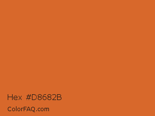 Hex #d8682b Color is a normal orange color and the nearest color is Vivid Red Tangelo #df6124. Hex code #d8682b and RGB value is rgb(216,104,43). In RGB color space, this color is composed of 85% red, 41% green, 17% blue, In CMYK color space, this color is composed of 0% cyan, 52% magenta, 80% yellow , 15% black , In HSL color space, this color has a hue angle of 21° , 69% saturation and 51% lightness.