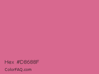 Hex #d8688f Color is a light rose color and the nearest color is Pale Red Violet #db7093. Hex code #d8688f and RGB value is rgb(216,104,143). In RGB color space, this color is composed of 85% red, 41% green, 56% blue, In CMYK color space, this color is composed of 0% cyan, 52% magenta, 34% yellow , 15% black , In HSL color space, this color has a hue angle of 339° , 59% saturation and 63% lightness.