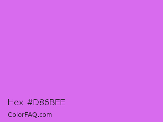 Hex #d86bee Color is a light purple color and the nearest color is Heliotrope #df73ff. Hex code #d86bee and RGB value is rgb(216,107,238). In RGB color space, this color is composed of 85% red, 42% green, 93% blue, In CMYK color space, this color is composed of 9% cyan, 55% magenta, 0% yellow , 7% black , In HSL color space, this color has a hue angle of 290° , 79% saturation and 68% lightness.