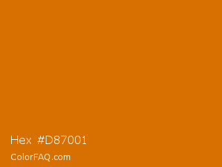 Hex #d87001 Color is a normal orange color and the nearest color is Bamboo #da6304. Hex code #d87001 and RGB value is rgb(216,112,1). In RGB color space, this color is composed of 85% red, 44% green, 0% blue, In CMYK color space, this color is composed of 0% cyan, 48% magenta, 100% yellow , 15% black , In HSL color space, this color has a hue angle of 31° , 99% saturation and 43% lightness.
