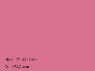 Hex #d8708f Color is a light rose color and the nearest color is Pale Red Violet #db7093. Hex code #d8708f and RGB value is rgb(216,112,143). In RGB color space, this color is composed of 85% red, 44% green, 56% blue, In CMYK color space, this color is composed of 0% cyan, 48% magenta, 34% yellow , 15% black , In HSL color space, this color has a hue angle of 342° , 57% saturation and 64% lightness.