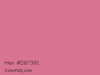 Hex #d87391 Color is a light rose color and the nearest color is Pale Red Violet #db7093. Hex code #d87391 and RGB value is rgb(216,115,145). In RGB color space, this color is composed of 85% red, 45% green, 57% blue, In CMYK color space, this color is composed of 0% cyan, 47% magenta, 33% yellow , 15% black , In HSL color space, this color has a hue angle of 342° , 56% saturation and 65% lightness.