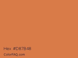 Hex #d87b48 Color is a normal orange color and the nearest color is Raw Sienna Crayola #d27d46. Hex code #d87b48 and RGB value is rgb(216,123,72). In RGB color space, this color is composed of 85% red, 48% green, 28% blue, In CMYK color space, this color is composed of 0% cyan, 43% magenta, 67% yellow , 15% black , In HSL color space, this color has a hue angle of 21° , 65% saturation and 56% lightness.
