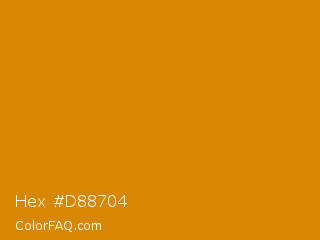 Hex #d88704 Color is a normal orange color and the nearest color is Harvest Gold #da9100. Hex code #d88704 and RGB value is rgb(216,135,4). In RGB color space, this color is composed of 85% red, 53% green, 2% blue, In CMYK color space, this color is composed of 0% cyan, 38% magenta, 98% yellow , 15% black , In HSL color space, this color has a hue angle of 37° , 96% saturation and 43% lightness.
