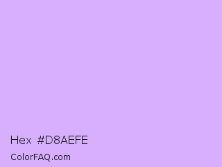 Hex #d8aefe Color is a very light purple color and the nearest color is Mauve #e0b0ff. Hex code #d8aefe and RGB value is rgb(216,174,254). In RGB color space, this color is composed of 85% red, 68% green, 100% blue, In CMYK color space, this color is composed of 15% cyan, 31% magenta, 0% yellow , 0% black , In HSL color space, this color has a hue angle of 272° , 98% saturation and 84% lightness.