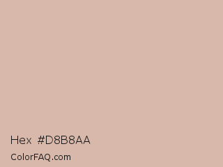 Hex #d8b8aa Color is a light orange color and the nearest color is Clam Shell #d4b6af. Hex code #d8b8aa and RGB value is rgb(216,184,170). In RGB color space, this color is composed of 85% red, 72% green, 67% blue, In CMYK color space, this color is composed of 0% cyan, 15% magenta, 21% yellow , 15% black , In HSL color space, this color has a hue angle of 18° , 37% saturation and 76% lightness.