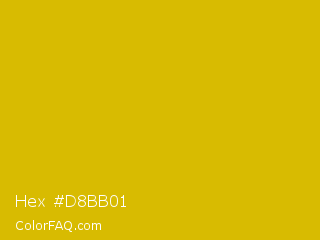 Hex #d8bb01 Color is a normal yellow color and the nearest color is Galliano #dcb20c. Hex code #d8bb01 and RGB value is rgb(216,187,1). In RGB color space, this color is composed of 85% red, 73% green, 0% blue, In CMYK color space, this color is composed of 0% cyan, 13% magenta, 100% yellow , 15% black , In HSL color space, this color has a hue angle of 52° , 99% saturation and 43% lightness.