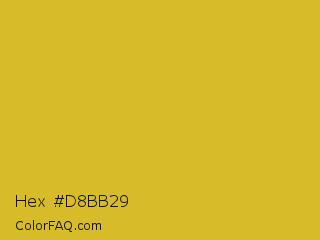 Hex #d8bb29 Color is a normal yellow color and the nearest color is Urobilin #e1ad21. Hex code #d8bb29 and RGB value is rgb(216,187,41). In RGB color space, this color is composed of 85% red, 73% green, 16% blue, In CMYK color space, this color is composed of 0% cyan, 13% magenta, 81% yellow , 15% black , In HSL color space, this color has a hue angle of 50° , 69% saturation and 50% lightness.