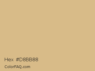 Hex #d8bb88 Color is a light orange color and the nearest color is Burlywood #deb887. Hex code #d8bb88 and RGB value is rgb(216,187,136). In RGB color space, this color is composed of 85% red, 73% green, 53% blue, In CMYK color space, this color is composed of 0% cyan, 13% magenta, 37% yellow , 15% black , In HSL color space, this color has a hue angle of 38° , 51% saturation and 69% lightness.