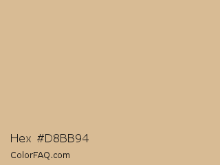 Hex #d8bb94 Color is a light orange color and the nearest color is Cameo #d9b99b. Hex code #d8bb94 and RGB value is rgb(216,187,148). In RGB color space, this color is composed of 85% red, 73% green, 58% blue, In CMYK color space, this color is composed of 0% cyan, 13% magenta, 31% yellow , 15% black , In HSL color space, this color has a hue angle of 34° , 47% saturation and 71% lightness.