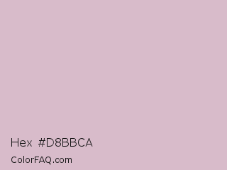 Hex #d8bbca Color is a light rose color and the nearest color is Pink Flare #e1c0c8. Hex code #d8bbca and RGB value is rgb(216,187,202). In RGB color space, this color is composed of 85% red, 73% green, 79% blue, In CMYK color space, this color is composed of 0% cyan, 13% magenta, 6% yellow , 15% black , In HSL color space, this color has a hue angle of 329° , 27% saturation and 79% lightness.