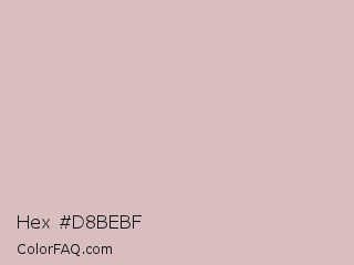 Hex #d8bebf Color is a light red color and the nearest color is Cavern Pink #e3bebe. Hex code #d8bebf and RGB value is rgb(216,190,191). In RGB color space, this color is composed of 85% red, 75% green, 75% blue, In CMYK color space, this color is composed of 0% cyan, 12% magenta, 12% yellow , 15% black , In HSL color space, this color has a hue angle of 358° , 25% saturation and 80% lightness.