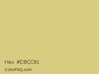 Hex #d8cc81 Color is a light yellow color and the nearest color is Straw #d4bf8d. Hex code #d8cc81 and RGB value is rgb(216,204,129). In RGB color space, this color is composed of 85% red, 80% green, 51% blue, In CMYK color space, this color is composed of 0% cyan, 6% magenta, 40% yellow , 15% black , In HSL color space, this color has a hue angle of 52° , 53% saturation and 68% lightness.