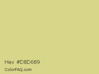 Hex #d8d689 Color is a light yellow color and the nearest color is Winter Hazel #d5d195. Hex code #d8d689 and RGB value is rgb(216,214,137). In RGB color space, this color is composed of 85% red, 84% green, 54% blue, In CMYK color space, this color is composed of 0% cyan, 1% magenta, 37% yellow , 15% black , In HSL color space, this color has a hue angle of 58° , 50% saturation and 69% lightness.