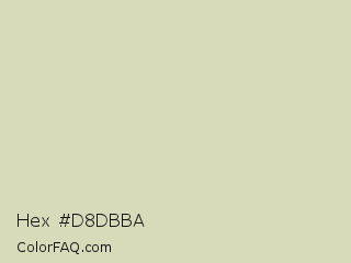 Hex #d8dbba Color is a light yellow color and the nearest color is Tana #d9dcc1. Hex code #d8dbba and RGB value is rgb(216,219,186). In RGB color space, this color is composed of 85% red, 86% green, 73% blue, In CMYK color space, this color is composed of 1% cyan, 0% magenta, 15% yellow , 14% black , In HSL color space, this color has a hue angle of 65° , 31% saturation and 79% lightness.