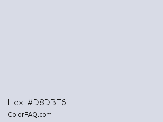 Hex #d8dbe6 Color is a very light blue color and the nearest color is Geyser #d4dfe2. Hex code #d8dbe6 and RGB value is rgb(216,219,230). In RGB color space, this color is composed of 85% red, 86% green, 90% blue, In CMYK color space, this color is composed of 6% cyan, 5% magenta, 0% yellow , 10% black , In HSL color space, this color has a hue angle of 227° , 22% saturation and 87% lightness.