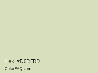 Hex #d8dfbd Color is a very light lime color and the nearest color is Tana #d9dcc1. Hex code #d8dfbd and RGB value is rgb(216,223,189). In RGB color space, this color is composed of 85% red, 87% green, 74% blue, In CMYK color space, this color is composed of 3% cyan, 0% magenta, 15% yellow , 13% black , In HSL color space, this color has a hue angle of 72° , 35% saturation and 81% lightness.