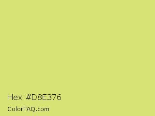 Hex #d8e376 Color is a light yellow color and the nearest color is Booger Buster #dde26a. Hex code #d8e376 and RGB value is rgb(216,227,118). In RGB color space, this color is composed of 85% red, 89% green, 46% blue, In CMYK color space, this color is composed of 5% cyan, 0% magenta, 48% yellow , 11% black , In HSL color space, this color has a hue angle of 66° , 66% saturation and 68% lightness.