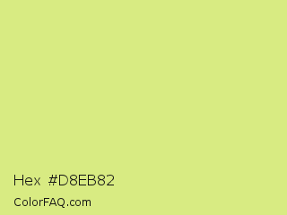 Hex #d8eb82 Color is a light lime color and the nearest color is Mindaro #e3f988. Hex code #d8eb82 and RGB value is rgb(216,235,130). In RGB color space, this color is composed of 85% red, 92% green, 51% blue, In CMYK color space, this color is composed of 8% cyan, 0% magenta, 45% yellow , 8% black , In HSL color space, this color has a hue angle of 71° , 72% saturation and 72% lightness.