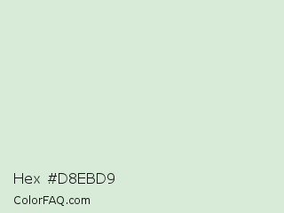 Hex #d8ebd9 Color is a very light green color and the nearest color is Zanah #daecd6. Hex code #d8ebd9 and RGB value is rgb(216,235,217). In RGB color space, this color is composed of 85% red, 92% green, 85% blue, In CMYK color space, this color is composed of 8% cyan, 0% magenta, 8% yellow , 8% black , In HSL color space, this color has a hue angle of 123° , 32% saturation and 88% lightness.