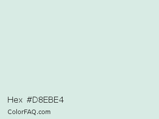 Hex #d8ebe4 Color is a very light green color and the nearest color is Swans Down #dcf0ea. Hex code #d8ebe4 and RGB value is rgb(216,235,228). In RGB color space, this color is composed of 85% red, 92% green, 89% blue, In CMYK color space, this color is composed of 8% cyan, 0% magenta, 3% yellow , 8% black , In HSL color space, this color has a hue angle of 158° , 32% saturation and 88% lightness.